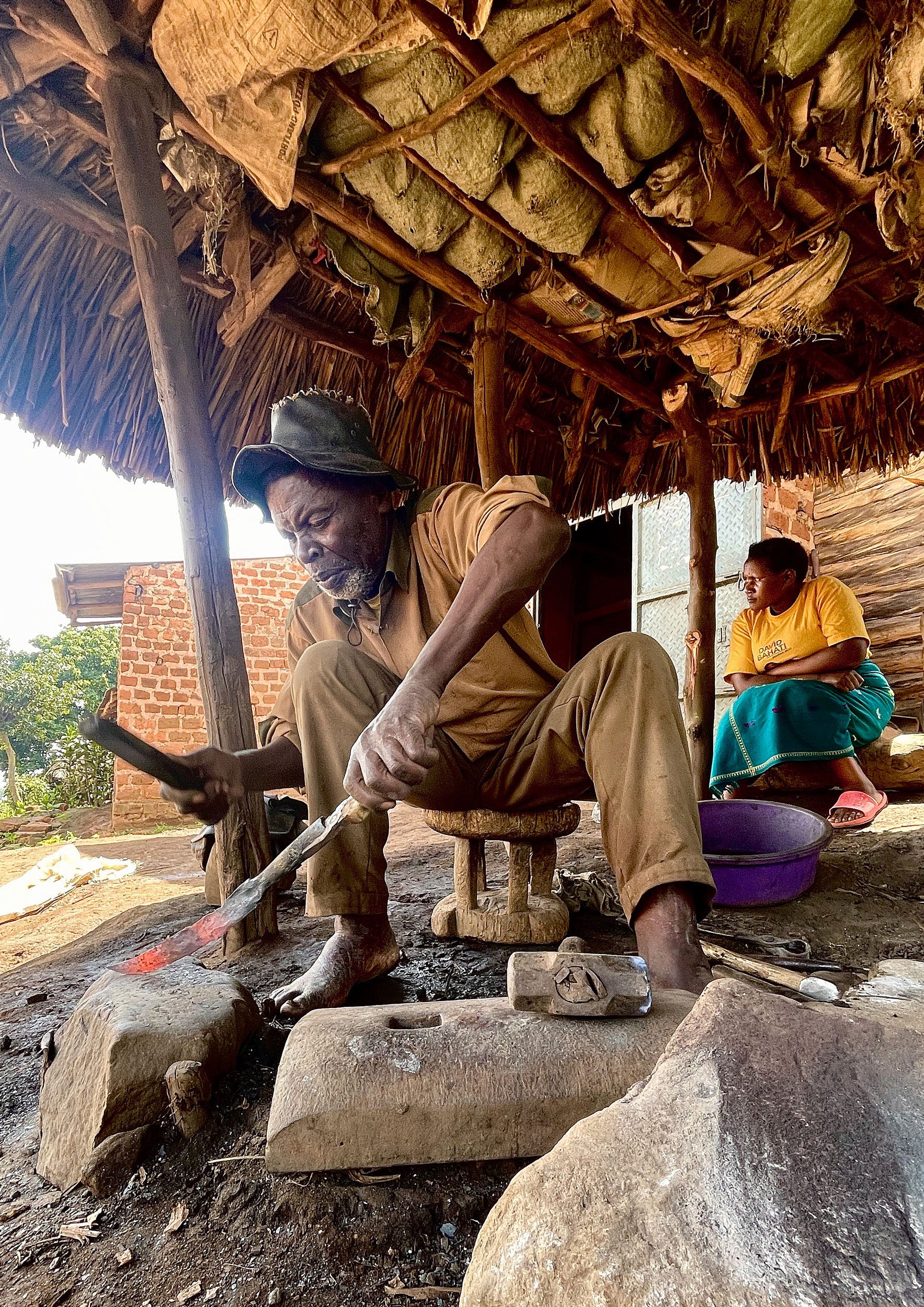 Once we set out to explore Uganda’s natural riches, Fred (our driver) and Isaac (tour company operator-Authentic Africa Safaris), made sure that we were comfortable, on time, and cared for during the two-week expedition. Their attention and flexibility were essential and made for such a grand tour. Stephen, a blacksmith from Bukoora, fashioned a matoke (plantain) cutting tool from scrap metal right before our eyes. Hillary and his Mom turned us on to banana gin (who knew there was such a thing!).