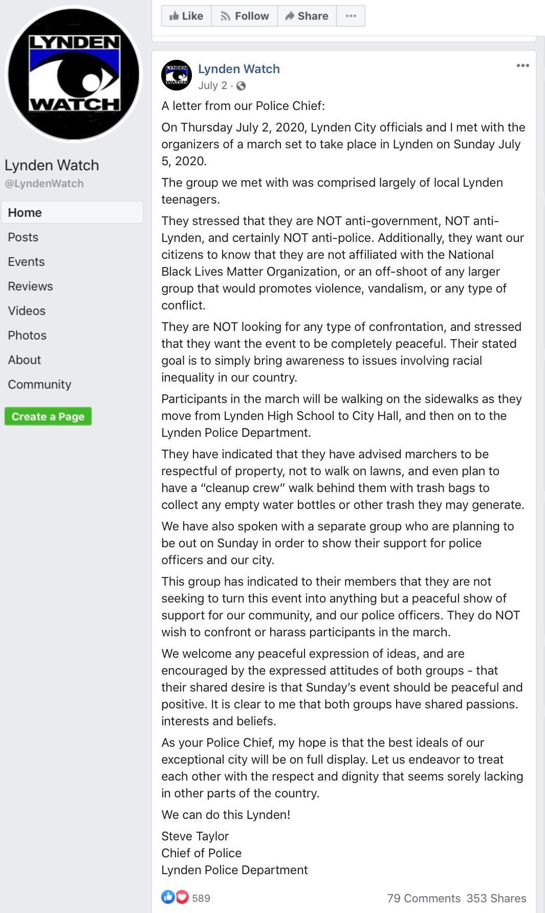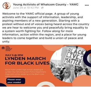 A day before the July 5th March for Black Lives, “Keith” posted the following comment on Facebook: “I’m sick of these blm protesters. Come to Lynden causing trouble mabey [sic] the kkk should meet them main street has a lot of tall trees along the way good hanging trees.”