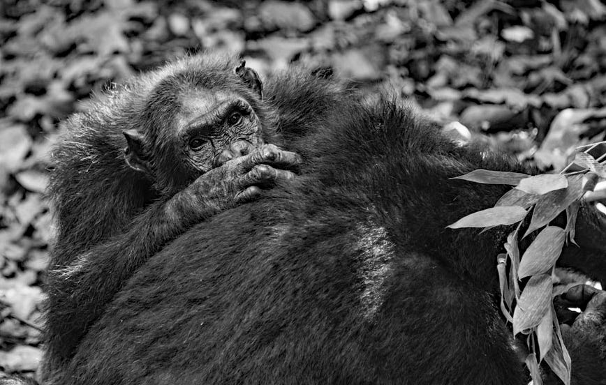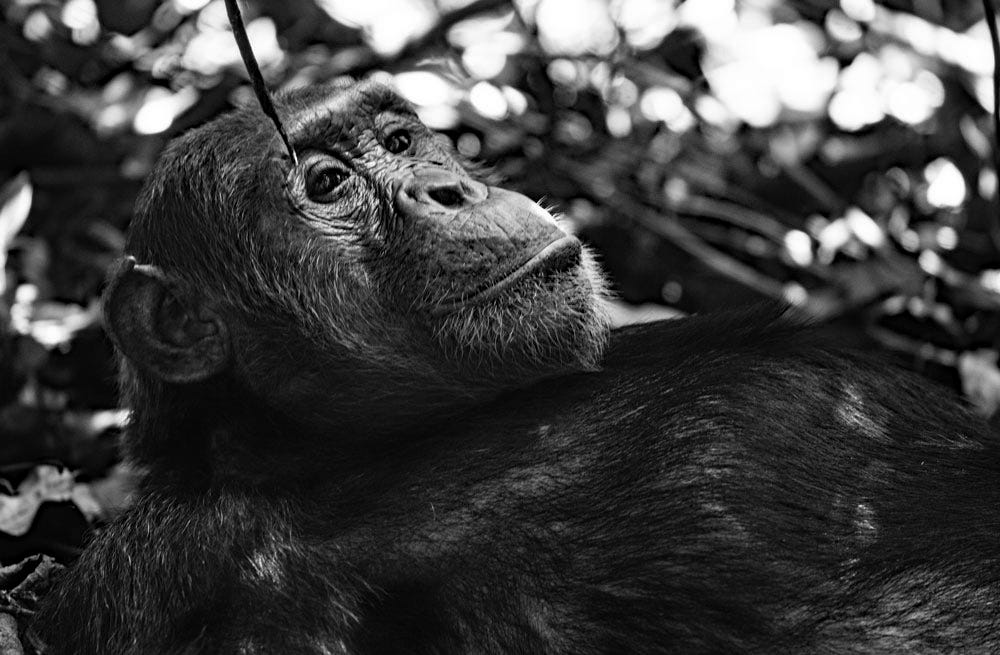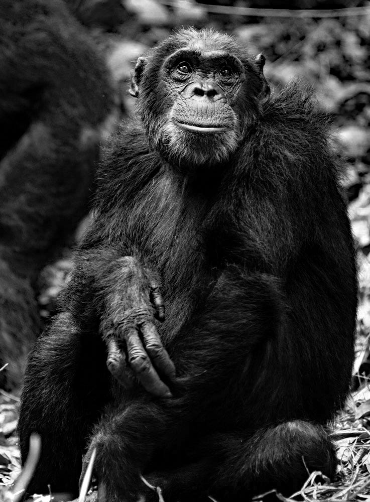 The moment you meet an animal in its own environment, on its turf, whether it’s a lion, elephant, or chimpanzee is a reminder of just how small and weak are we humans. Simultaneously, those moments also call out for celebration and awe-that there are creatures on this planet that can still inspire awe and joy, simply because they exist. The first chimpanzee Joscelyn and I saw, Nkombo, looked into our eyes and it was all we could do to not break down weeping on the spot. As we later learned, her story is compelling, fascinating, and heartbreaking. At 51 (in 2021), Nkombo was one of M group’s oldest females and dominant matriarchs. However, she’d never had offspring of her own, her pregnancies all ending in miscarriages, or stillborn babies.