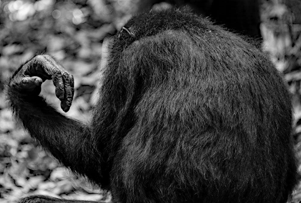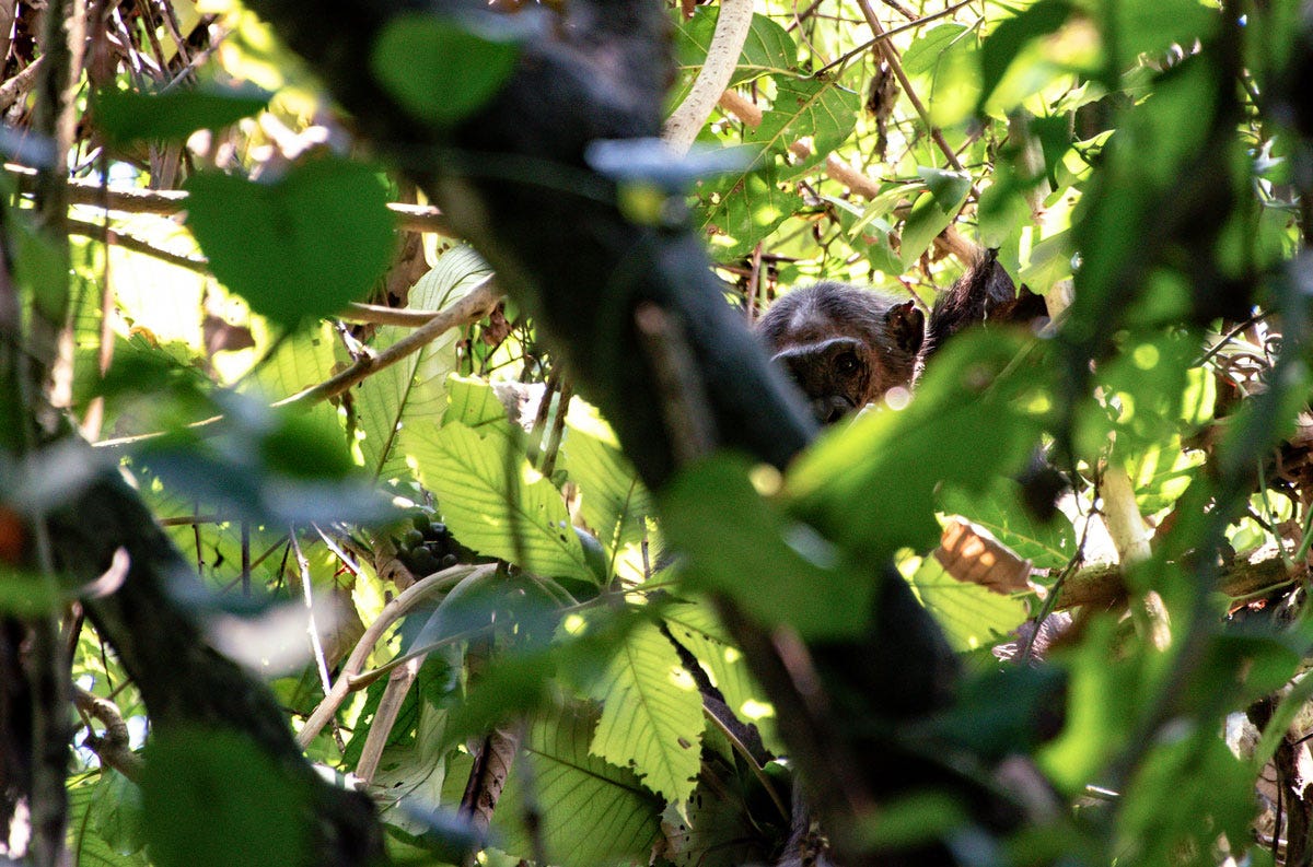 All the anticipation, orientations, and research cannot prepare you for that first face-to-face moment, though. It’s one thing to see a chimpanzee on the screen, or in a zoo, but to encounter a group in their forest, in their world, is an incomparable and humbling privilege. Our small group of humans gathered in awe as a half dozen chimpanzees watched us from the limbs above, calmly snacking on fruit and leaves. For a short time, we were within the ten-meter limit, the cramped forest opening prevented us from moving further away but the chimps eventually wandered off on their own seeking more food and, if I were to anthropomorphize, some privacy.