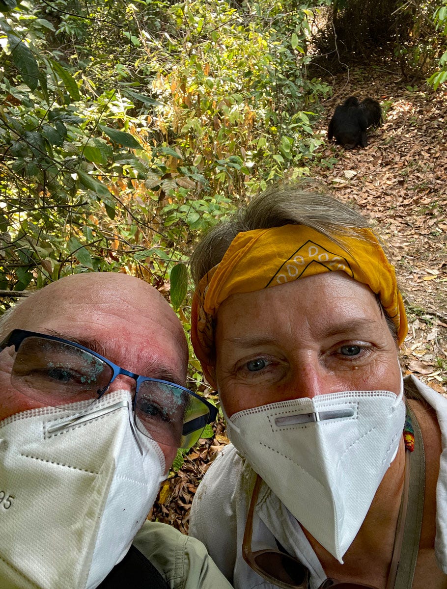 Bearing all this history in mind, Joscelyn and I had high expectations for this leg of our Africa adventure. Upon arrival at Greystoke, we received an orientation on interacting with chimpanzees. The rules are extensive and designed to provide maximum protection for the chimps: a limit of 6 visitors in a group and 1 hour per day in the chimps’ presence; masks must be worn; maintain a distance of 10 meters; no smoking or eating; minimum age of 12; no flash photography. Other recommendations included bringing plenty of water, dressing lightly and protectively (long trousers, sleeves, and a hat), wearing sturdy hiking shoes.